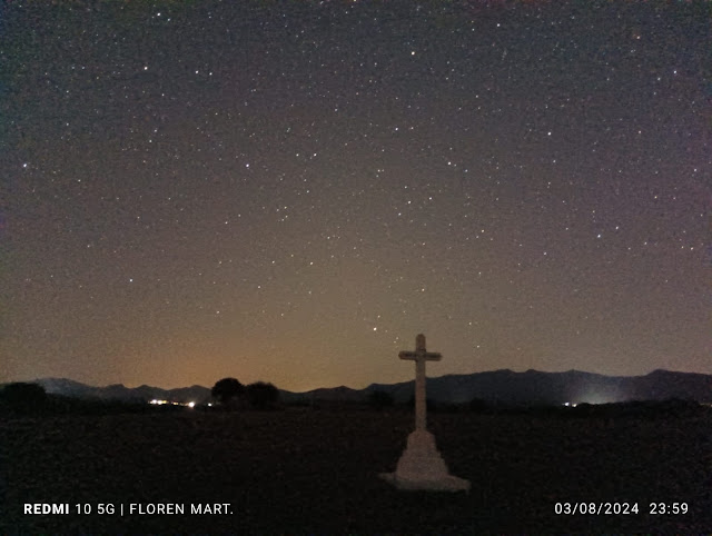 La noche del novilunio de Agosto de 2024 hice esta foto desde la Cruz de las Ánimas. En ella se ve la Peña de Francia, La Canchera, Villarejo y Agallas. Así como el planeta Saturno, arriba y a la izquierda de la Cruz: